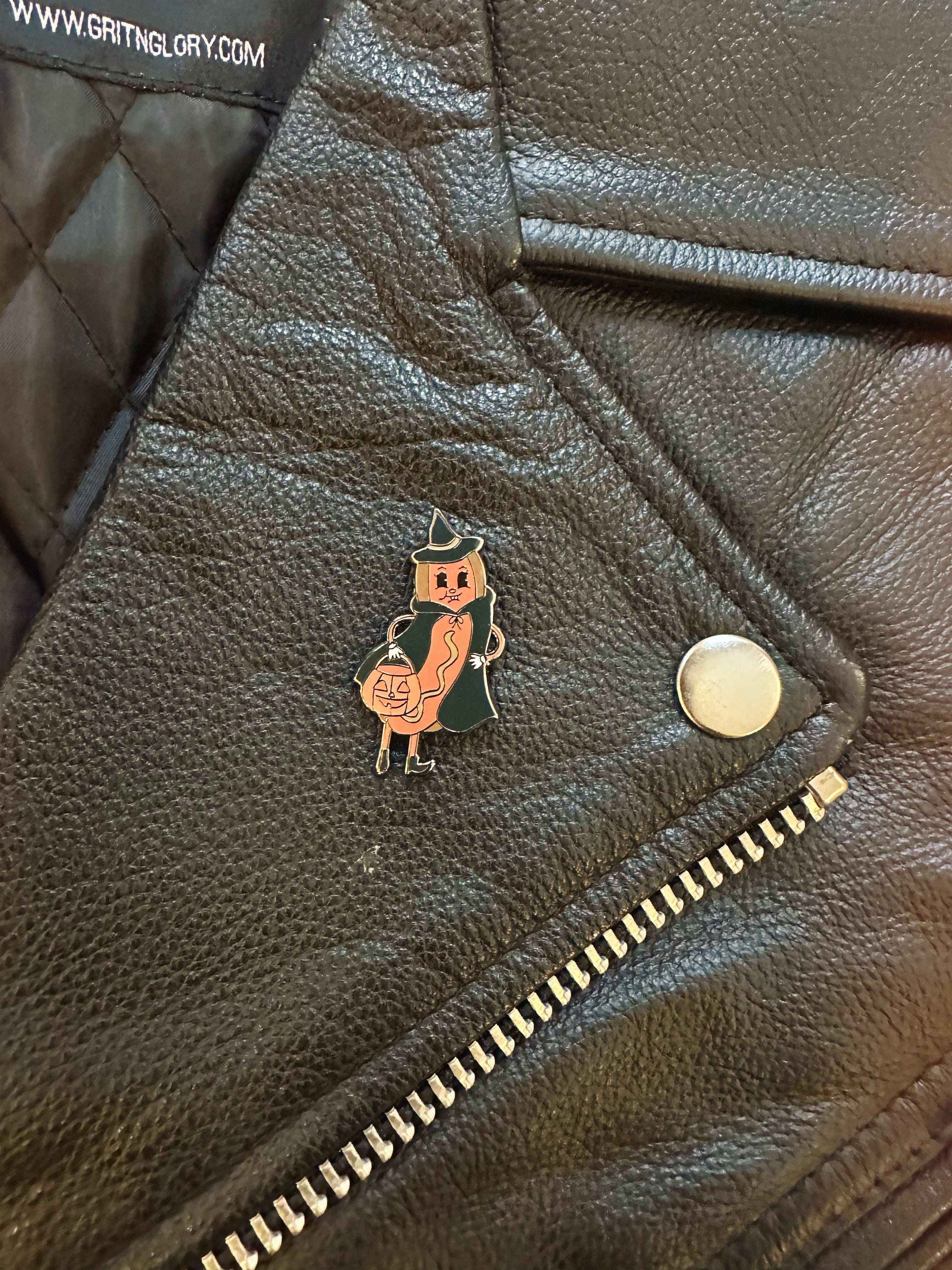 Molly Illustration's Feelin' Halloweenie Enamel Pin. This cute, spooky pin features a trick-or-treating hot dog dressed up as a witch.