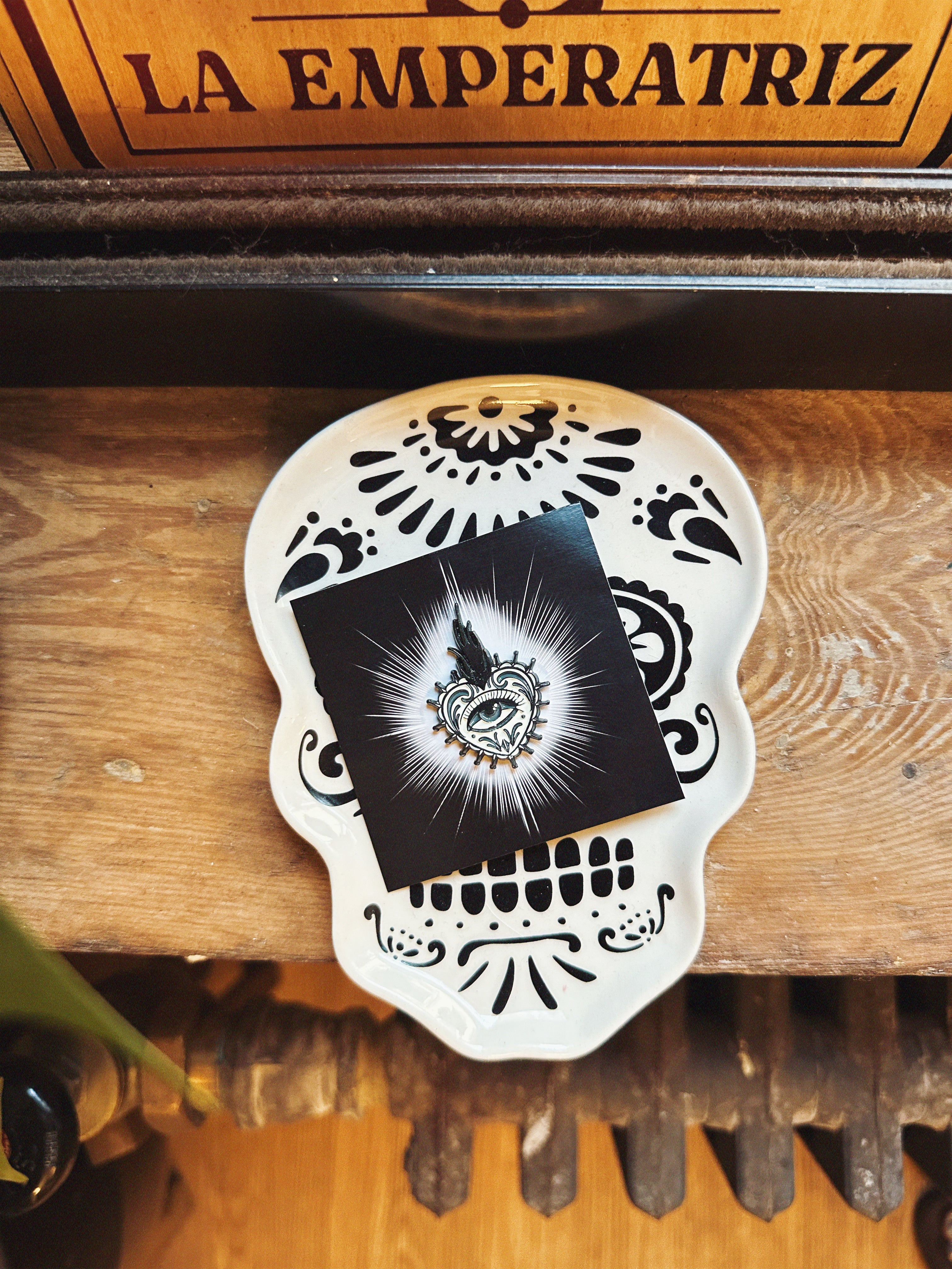 Grit N Glory resident tattoo artist Elvia Guadian's black and white Sacred Heart Pin. This soft enamel pin features a sacred heart with eye design. Measures approximately 1".